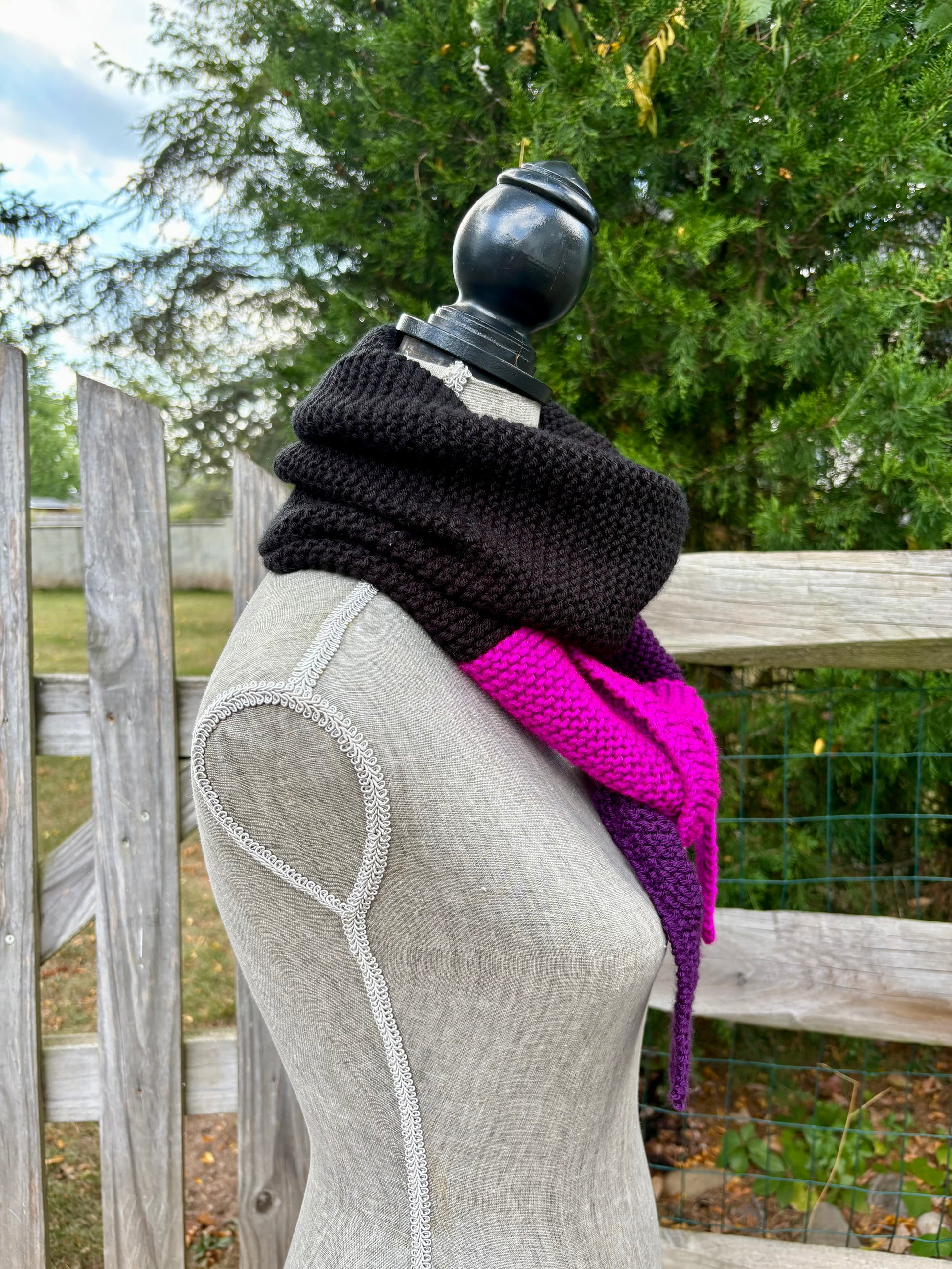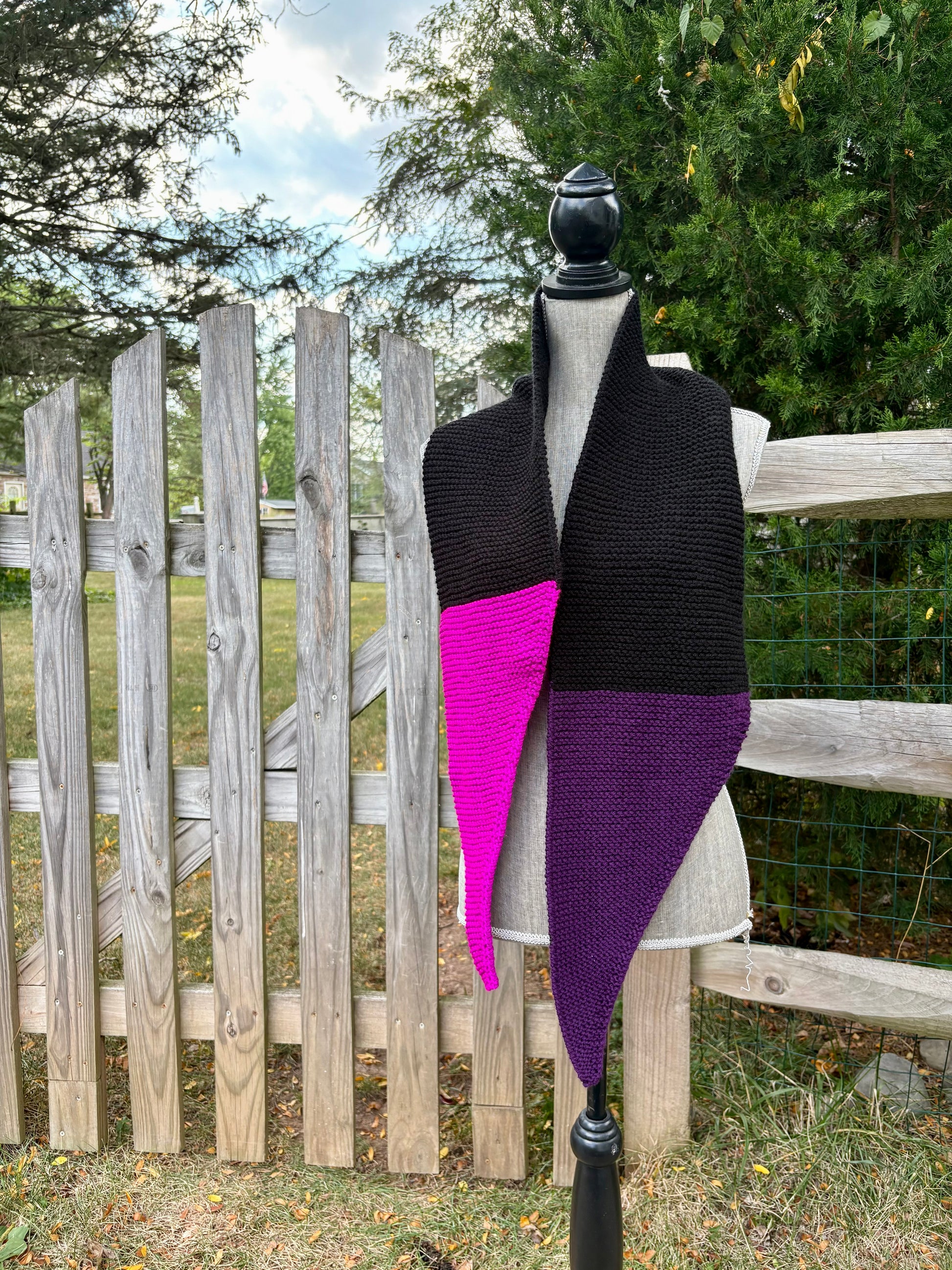 A modern twist on a timeless classic, this hand-knitted scarf features bold color transitions in black, deep aubergine, and vibrant fuchsia. With its clean lines and uniquely tapered tips, this piece offers both warmth and style — a striking accessory that layers beautifully for the fall and winter seasons.